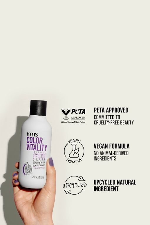 KMS ColorVitality Blonde Conditioner er udviklet til dig, der ønsker at bevare en kold blond tone uden uønsket gult skær. Den indeholder violette pigmenter, som effektivt neutraliserer varme toner i blondt, lysnet eller gråt hår – samtidig med at den plejer og fugter håret.
