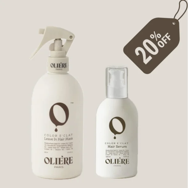 Giv dit farvede hår den ultimative daglige pleje og beskyttelse med COLOR E’CLAT Leave-In Duo fra OLIÉRE PARIS. Denne pakke kombinerer to af seriens mest effektive leave-in produkter, der tilsammen giver intensiv fugt, glans og farvebevarelse – uden at håret skal skylles efter behandlingen.