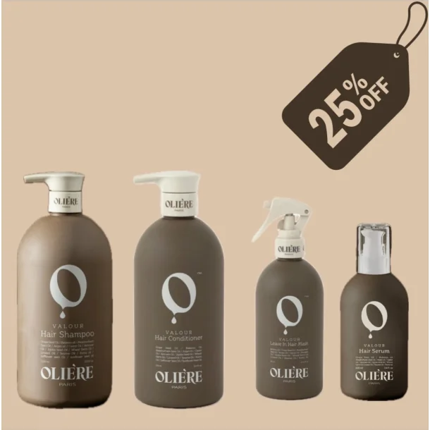 Oplev den fulde styrke af OLIÉRE PARIS’ prisvindende VALOUR-serie med dette ultimative sæt, skabt til at genopbygge, beskytte og forvandle varmeskadet hår.